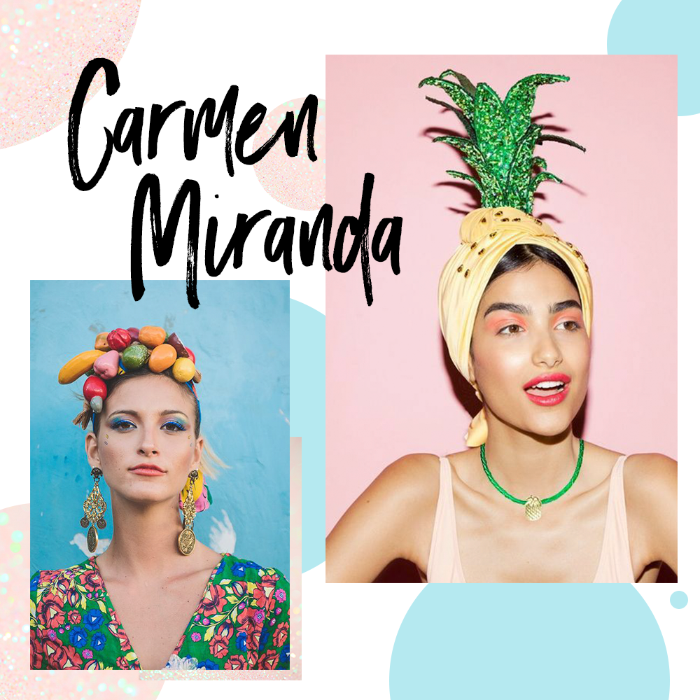 A fantasia mais tropical, alegre e a cara do carnaval… Para encarnar Carmen Miranda aposte numa make com cores vibrantes. Nos lábios um brilho rosado ou alaranjado ajuda a dar aquele ar de saúde e nos olhos uma sombra azul ou verde com acabamento glossy são muito bem vindas. Ah, e não tenha medo de pegar pesado no iluminador!