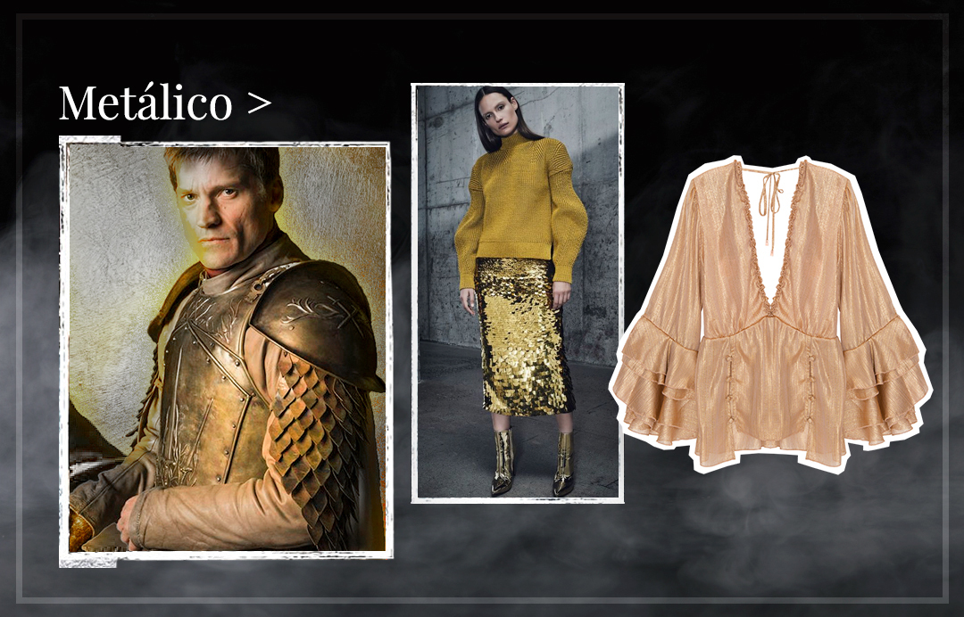 Brilhantes, reluzentes e adornadas nos detalhes é como são as armaduras de Game of Thrones. Se você quer um toque moderno no seu look, então se joga nos metalizados, eles tornam tudo mais interessante e descolado. Aposte em saias, vestidos e sapatos com esse acabamento, podendo ser prata, dourado, cobre ou ouro velho.