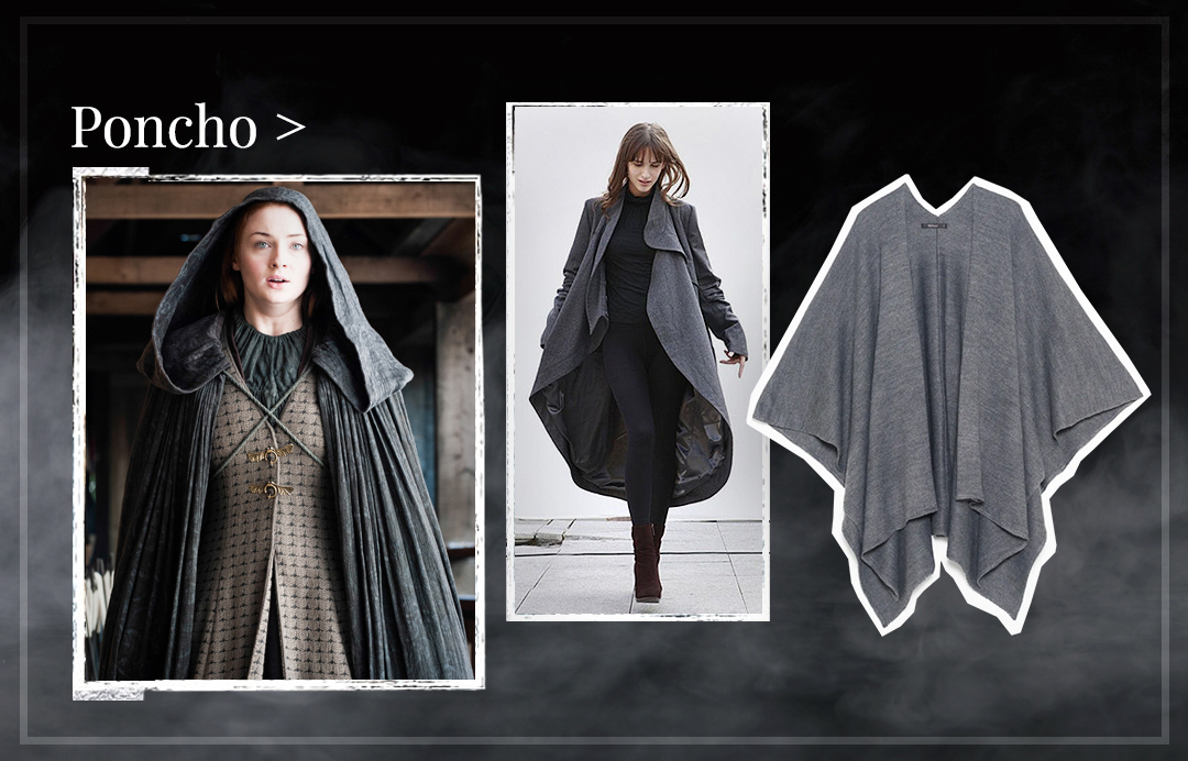 A menina mais velha dos Starks, Sansa, adora um poncho e, no frio, quem não ama, não é mesmo? Uma peça que descreve conforto e elegância. Além disso, ela é hiper quentinha. O modo ideal de usar a trend é com uma calça mais justa, fazendo assim uma contrapartida, peça larga em cima + justa embaixo, criando o look equilibrado.