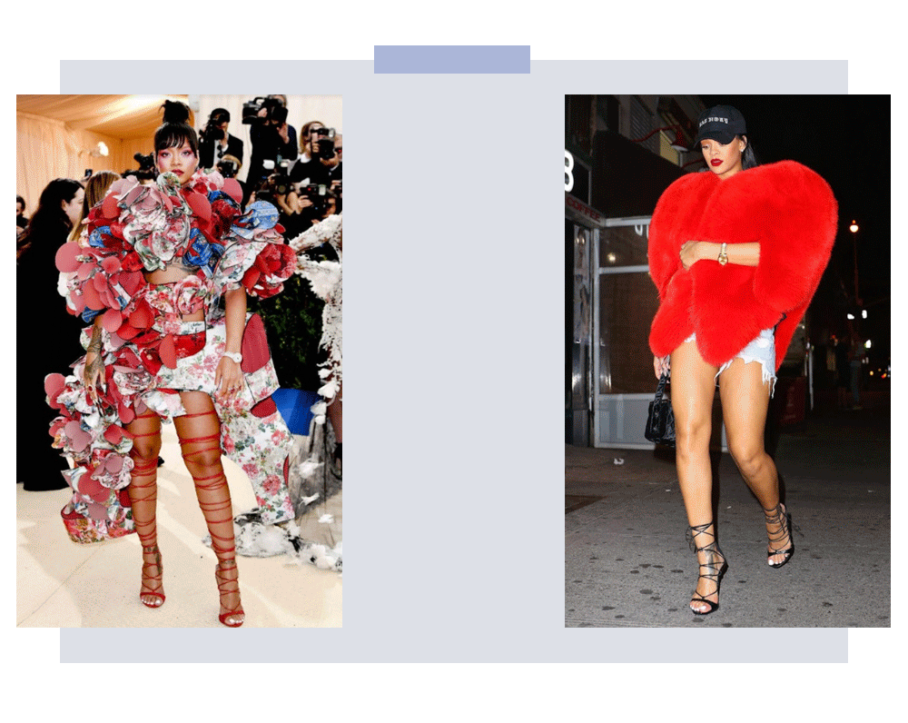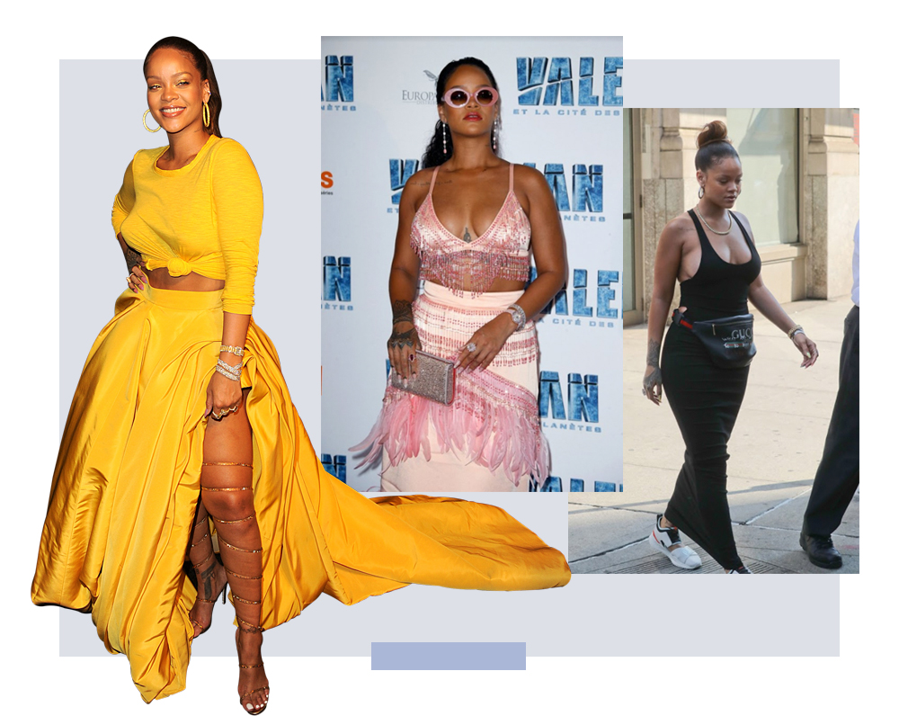 Rihanna se destaca por seus looks ousados e excêntricos, principalmente nos red carpets. Ela não tem medo dos olhares e das críticas e veste aquilo que expressa sua personalidade e ainda nos ensina que a moda pode ser muito divertida!