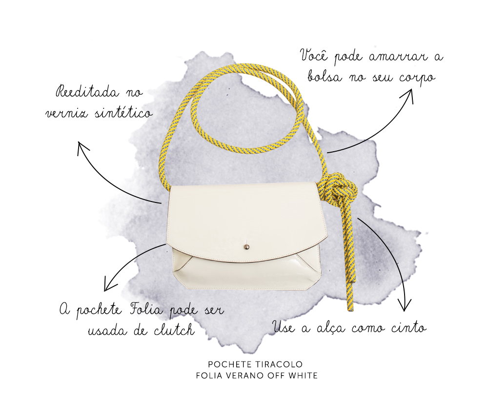 Pensando sempre na versatilidade das peças, a aposta da coleção é a bolsa Verano, um novo shape que mantém o DNA da Paseo – com o formato de um leque aberto de ponta cabeça. Acompanhando uma necessaire, o modelo em tela com ferragens, se rende a mistura de referências da próxima estação inspiradas nas redes de pesca e bolsas de feira