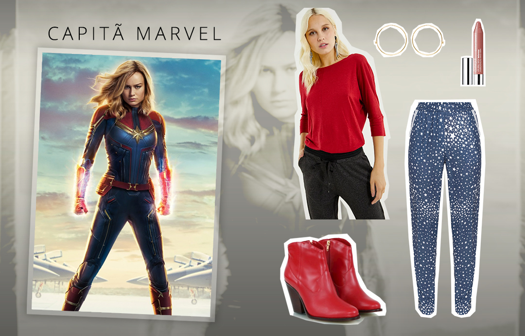 Surpreendendo a todos, a Capitã Marvel é a promessa do filme. No estilo ‘American Way of Life’, carrega os emblemas americanos no look, cores marcantes como vermelho e azul marinho.